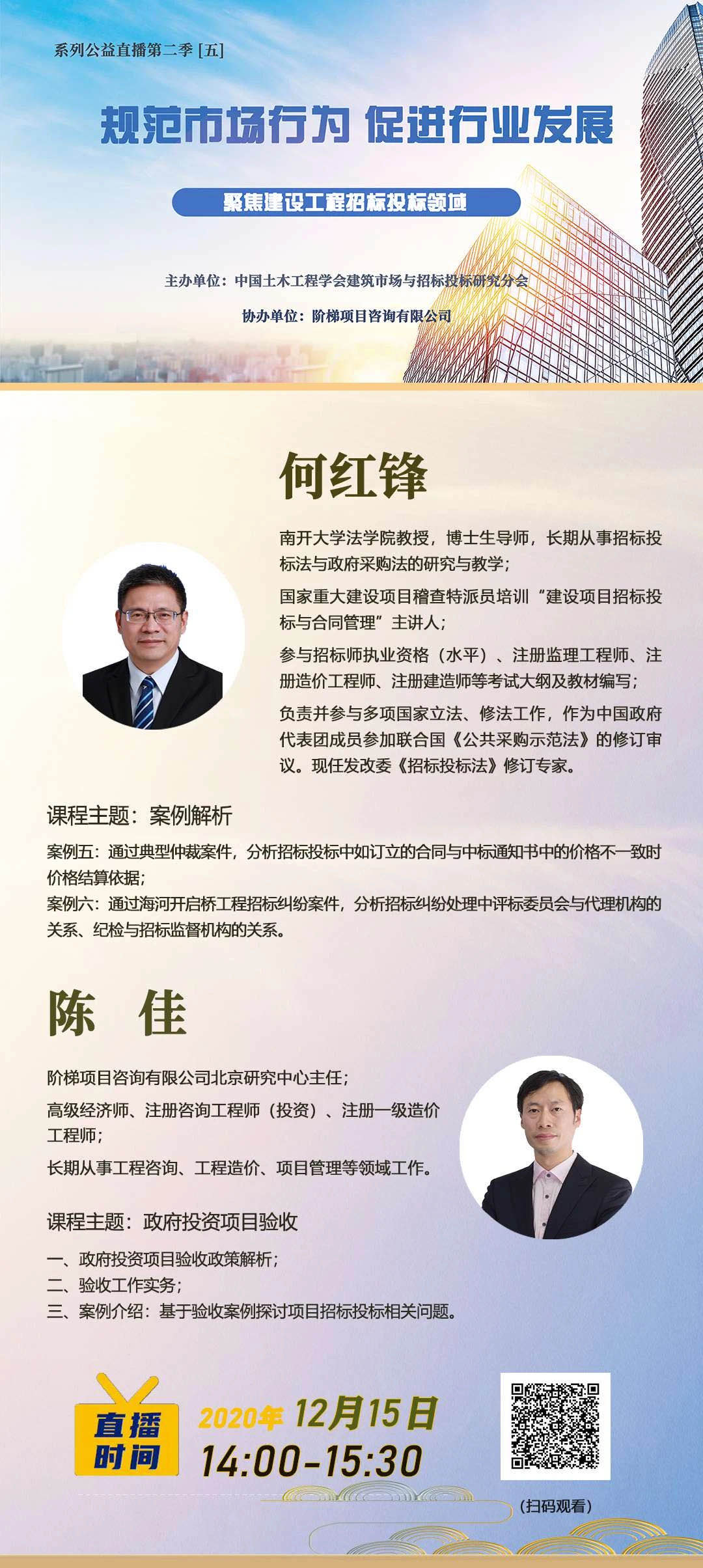由中国土木工程学会建筑市场与招标投标研究分会主办,阶梯项目咨询有限公司协办的“规范市场行为 促进行业发展”——聚焦建设工程招标投标领域系列第二季第五期公益直播活动,将于2020年12月15日14时00分直播。具体通知如下:
