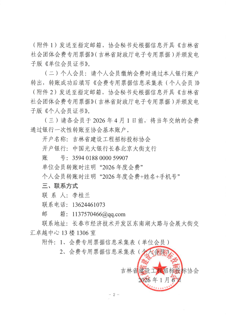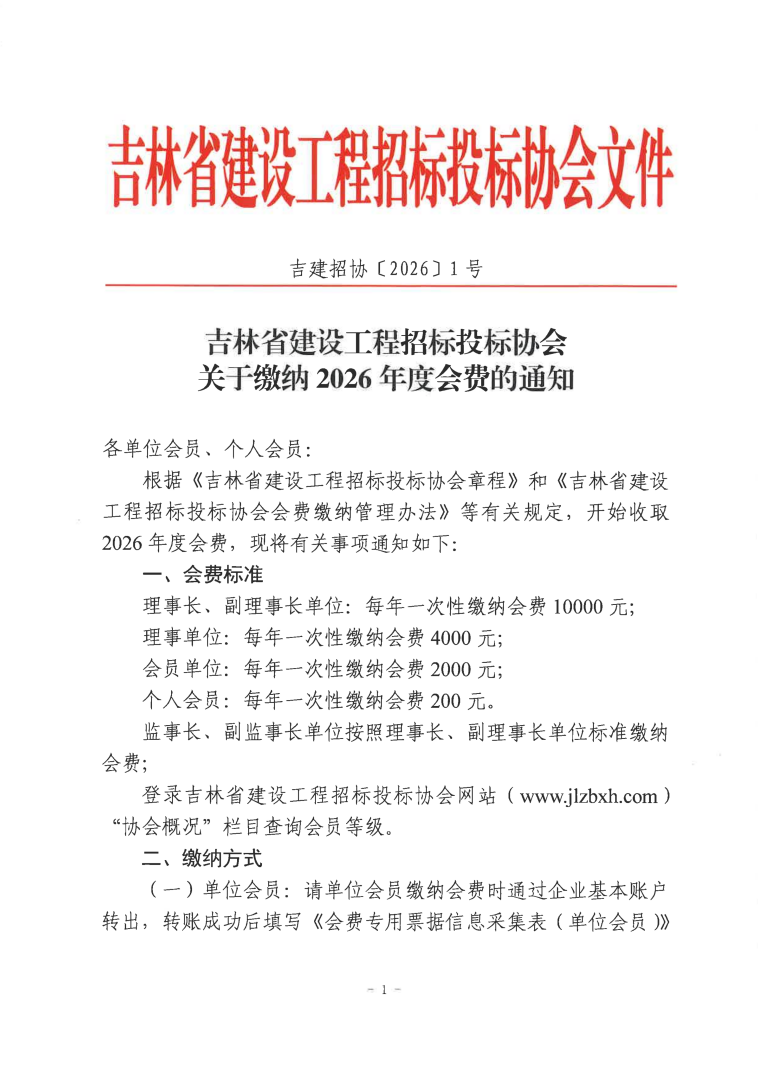 吉林省建设工程招标投标协会关于缴纳2026年度会费的通知